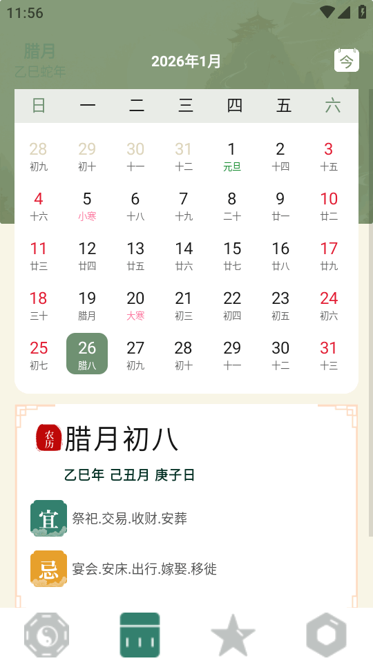 界面极简的一款免费手机查看老黄历的工具,免费老黄历专业版即装即用,打开可以当成一个手机上的老黄历万年历工具,操作非常方便,不用注册登录无需要任何的权限即可使用,支持离线操作,查看双历对照,文化标记,五行信息等,还有备忘录功能,很易于使用。