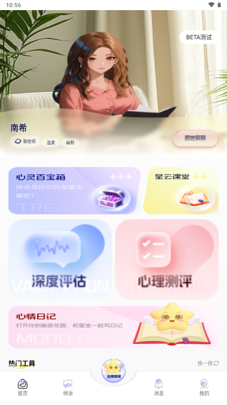 通过AI聊愈、AI测评、心灵百宝箱、心理课程等有趣内容,像寻宝般深入自己的内在,挖掘属于你的内心宝藏。
