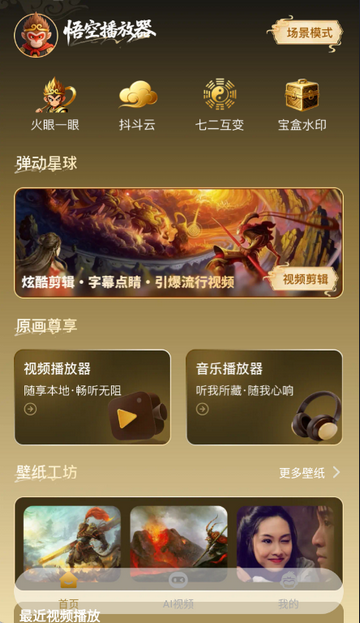 悟空播放器是一款以孙悟空为主题风格的多功能影音工具,主打趣味与实用结合。APP核心支持本地视频、音乐播放,同时内置丰富影音创作工具,搭配AI视频管家辅助操作,兼顾播放、创作、资源下载等多场景需求,为喜欢个性工具的用户提供便捷、有趣的影音使用体验。