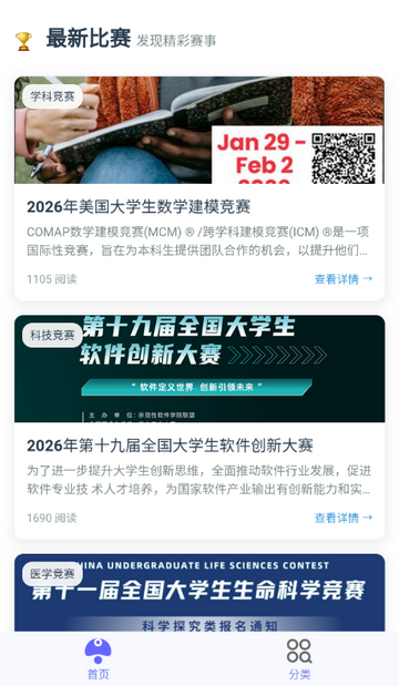 4、操作简单、无多余干扰,可利用零散时间查找赛事、设置提醒,适配大学生日常学习与备赛节奏。