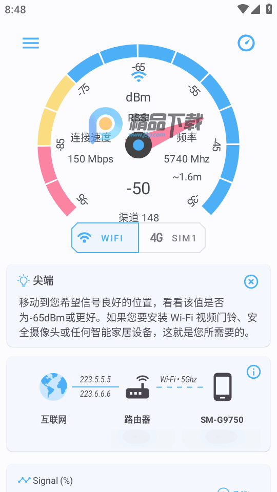 网络信号专业版英文原名Net Signal Pro是一款查看手机wifi和5g/4g信号强度的检测工具,支持实时信息,无论是在任何场所联网即可查看,可以帮助用户更快的找到连接的位置,很适合用于优化家中的各种网络。支持信息面板直接共享在屏幕上,便于监控。