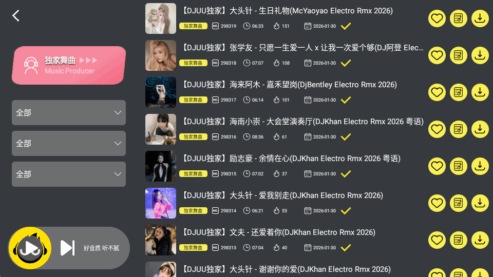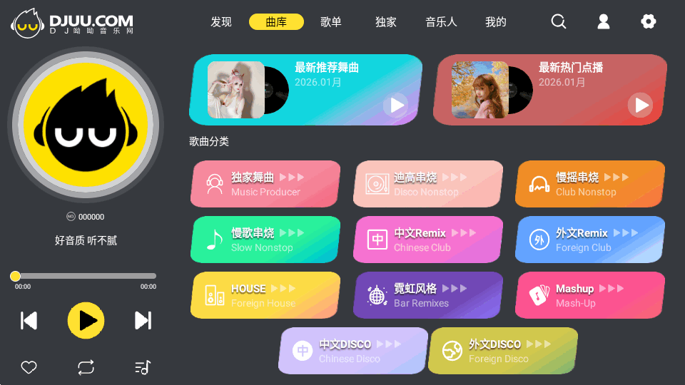 专为车主车机车载场景打造的一款dj音乐舞曲播放平台,DJUU车机版又名dj呦呦网车机端,这里拥有各种中文串烧dj热门舞曲,即点即播放,提供了一键收藏分享等功能,下载歌曲需要u币,可以与车载音响系统深度融合,让驾驶者在旅途中尽享震撼的DJ音乐体验!