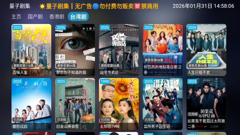 量子剧集 是一款基于 影视仓架构 开发的电视端影视聚合应用,预置专属“量子单线”源,无需手动导入JSON或M3U链接,安装后启动即自动加载资源库。软件聚焦电影、电视剧、动漫及短剧等全类型内容,界面简洁直观,首页智能推荐热门与个性化影片,支持高清播放与流畅追剧体验,全程无广告干扰。