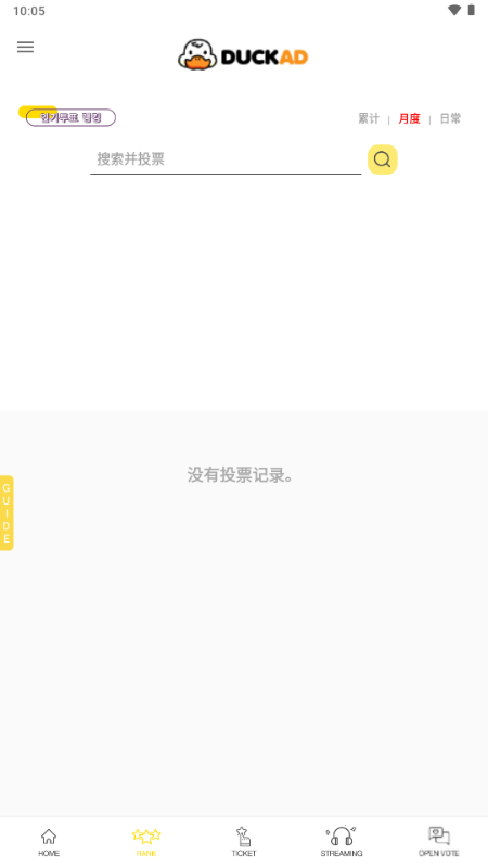 DUCKAD 是一款专为 K-pop 粉丝打造的偶像应援投票专属应用,汇聚多元应援功能,成为粉丝为偶像打榜、助力发展的核心工具,让每一份喜爱都能转化为偶像的实际荣誉与资源。这款应用以丰富的投票活动为核心,可获得 “本月最佳偶像组合” 官方奖杯投票。