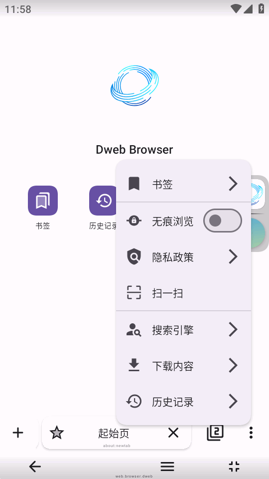 可以自由拖动界面化繁为简一款手机浏览器软件,自由穿梭浏览器又名DWeb Browser浏览器,拥有很清爽的首页,支持自由设置书签和历史一键轻松管理,支持无痕模式浏览,更好的保护用户的隐私,智能搜索想访问的页面,热点引擎内容轻松查看。