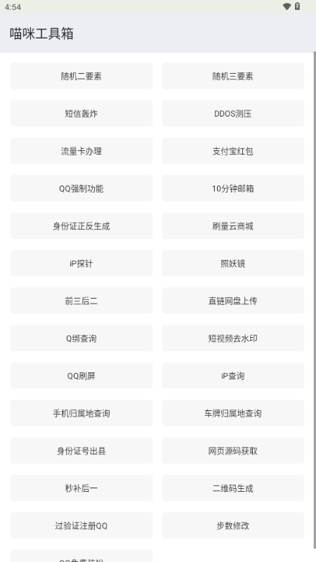 猫咪工具箱是一款QQ专用工具箱,可用于QQ相关的一系列功能,例如QQ强制聊天,QQ刷屏,QQ查询,QQ注册等等,也支持短视频去水印,功能非常多还在新增新的功能,可以满足用户的使用需求,需要的可以下载。
