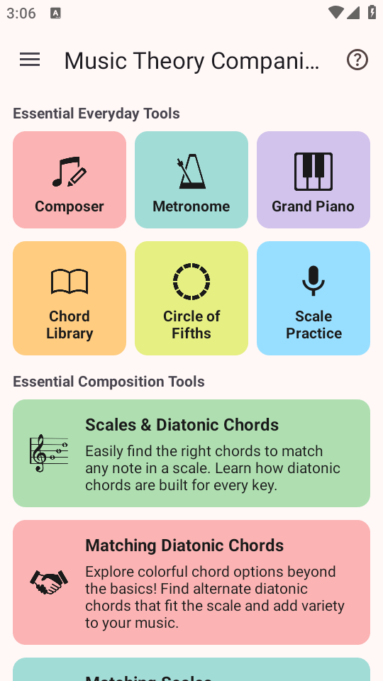 功能相当丰富的一款音乐家必备的全能辅助作曲工具,音乐理论伴侣(Music Theory Companion)又名音乐乐理伴侣助手,软件中整理了作曲工具,节拍器,三角钢琴模拟练习,和弦库功能,五度圈及音阶在线练习等功能,所有内容免费学习使用,爱好音乐的朋友必备。