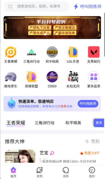 1、涵盖主流电竞手游、端游及国际服,无需切换平台即可找到对应游戏陪玩。