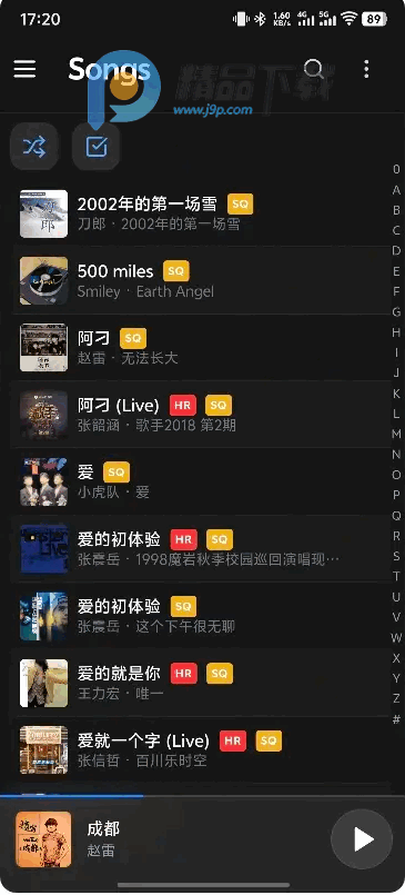 音质标签显示 (HR: Hi-Res, SQ: 无损)