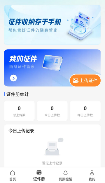 3、点击证件册,可上传各类证件,方便查找