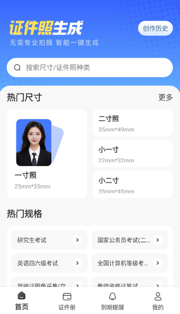 2、进入软件首页,可制作各种尺寸证件照等