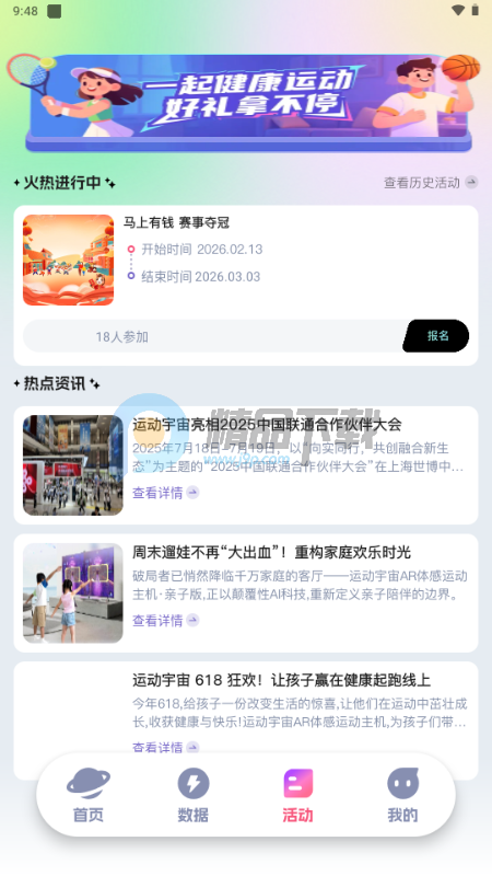 运动宇宙是一款以 AR 技术为核心的体感运动主机应用,主打趣味化健身与居家锻炼,将传统运动与互动游戏巧妙结合,有效提升健身趣味性,让用户在轻松娱乐中实现高效燃脂。依托精准的动作识别系统,它能实时捕捉用户姿态,保证运动规范性与数据准确性,带来沉浸式的互动体验。