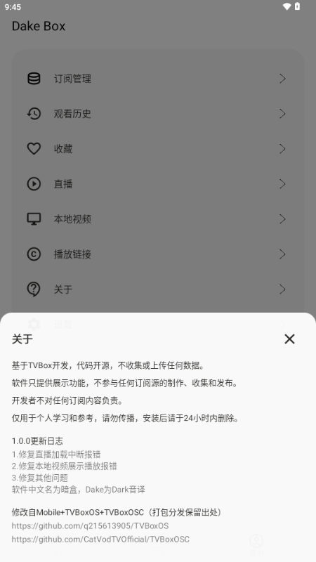 Dake Box 暗盒是一款面向移动端打造的轻量化自定义播放工具,基于现有开源框架优化而来,主打简洁稳定的使用体验。本次版本以修复已知问题、提升运行流畅度为核心,没有添加多余功能,整体界面清爽、操作直观,适合追求极简使用感的用户。
