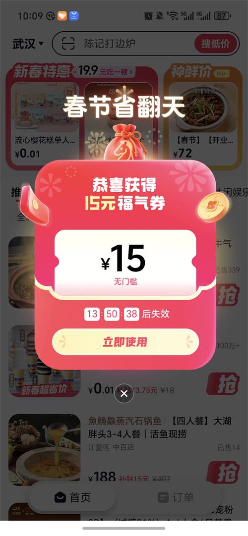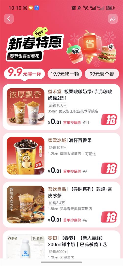 新用户首周每天领至多12元优惠券,春节畅吃、畅喝乐不停~
