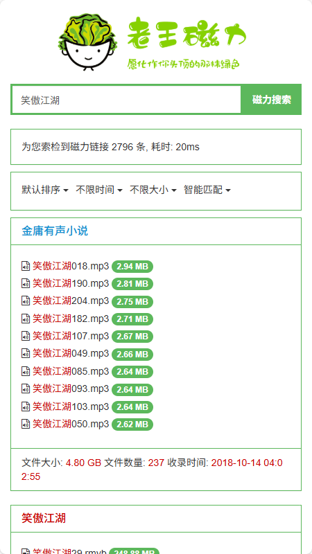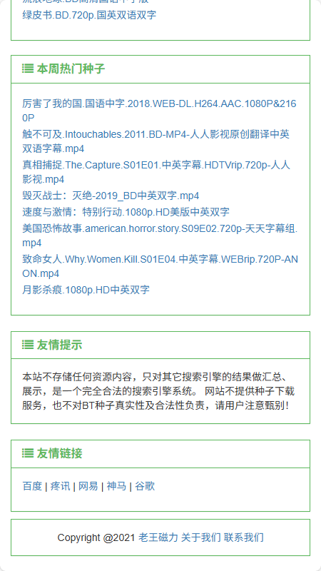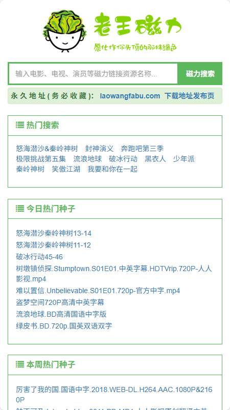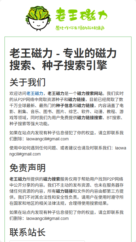 欢迎访问老王磁力,老王磁力是一个磁力搜索网站。我们实时的从P2P网络中爬取资源种子和磁力链接,目前已经爬取了数千万全球最新、最热门的种子信息和磁力链接,内容涵盖了电影、剧集、音乐、图书、图片、综艺、软件、动漫、教程、游戏等领域,同时我们为用户免费提供磁力链接搜索、BT搜索、种子搜索等强大功能。
