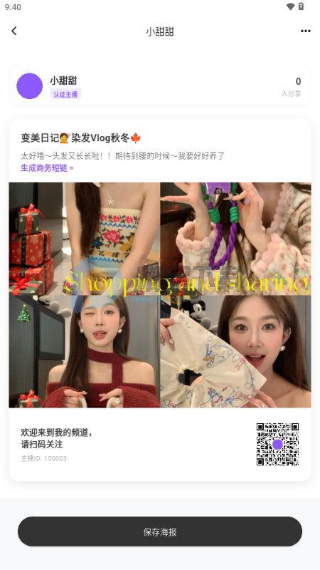 专属名片生成:支持一键生成高清主播名片海报,内置个性化二维码,轻松保存至系统相册。