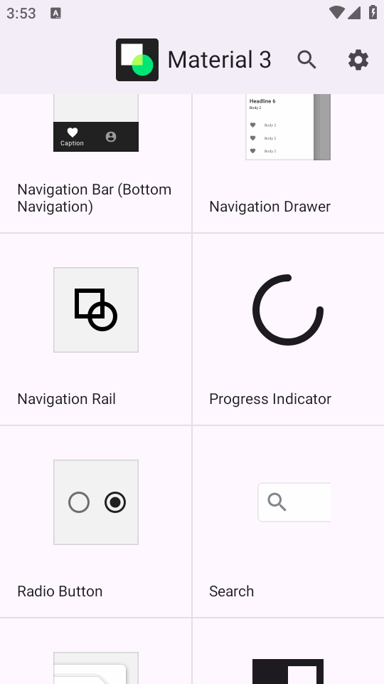 Android模块化且可自定义的材质设计UI组件,全称Material Components简称为MDC,M3 Catalog是可以轻松浏览查看目录效果的软件,支持搜索功能,可以根据自己的喜好来查看效果,主题风格,字体大小等,喜欢谷歌MDC风格的朋友,想要接入此组件的可以看看。