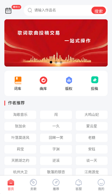 这是国内专业的歌词歌曲交易平台,核心用途是为词曲作者、音乐人、歌手、唱片公司提供原创音乐买卖服务,搭建供需双方高效对接的桥梁,规范原创音乐交易流程,保障交易双方权益,推动原创音乐的流通与发展,感兴趣的朋友快来试试吧,更多惊喜更你探索。