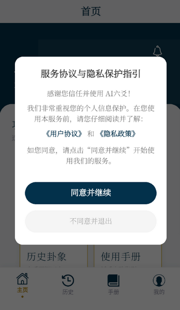 1、打开AI六爻app,点击同意隐私政策
