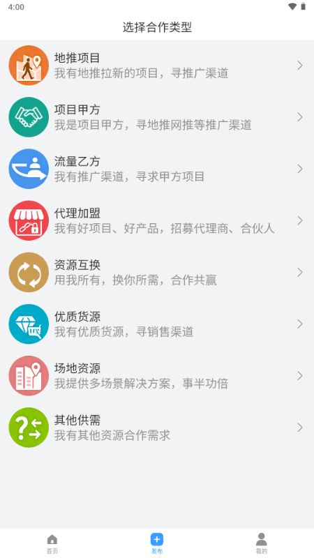 免费快捷发布合作需求,响应即时直达,快速建立合作,省去中间繁琐环节。快推帮发布类型有:地推项目;项目甲方;流量乙方;代理加盟;资源互换;优质资源;场地资源;其他供需。地推项目包括拉新(APP拉新,小程序,网页,公众号,社群,私域和其他拉新)项目甲方有官方广告主,官签甲方,服务商,渠道商代理商,放单员,接单平台,任务平台,问卷调查,商户入驻,打车平台,电商平台,门店/机构和其他项目甲方,合作方式有:CPA/CPS/CPC/CPM/CPT/CPD/CPL/CPI/CPSA等,乙方渠道有:全部信息流广告,地推,任务量,社群,自媒体,DSP,聚合积分墙,广告媒体,短信EDM,线下场景,搜索引擎,互动广告,移动端,PC端,视频/直播,TMK外呼等乙方渠道。资源互换类型有:线上广告位,线下广告位,流量互推,自媒体/社群,品牌|IP联合,优惠卡券,体验服务,用户权益,实物赞助,费用支持,联合活动,场地资源,社区/校园,商超/酒店,推广渠道,API接口等其他合作。优质资源有:食品饮料,水果生鲜,服饰箱包,家电数码,珠宝首饰,家居日化,文娱摆件,运动装备,汽车周边,茶叶养生,虚拟产品,主播带货,视频带货,电商渠道,线下渠道,积分商城,社区团购,代理/加盟,微商社群,品宣推广,MCN机构,合作/分销等其他优质资源。代理加盟类型有:餐饮加盟,特色加盟,美容健康加盟,生活服务加盟,服装鞋包,建材加盟,汽车服务加盟,教育/母婴加盟,机械加盟,家居环保加盟,礼品/小商品加盟,农业加盟等。结算周期有:日结,周结,月结,可商议。付费方式有:先付费,后付费,预付部分,可商议。不管你是什么需求,比如:地推拉新,创业项目,流量变现,副业兼职,人脉社群,异业合作,资源对接,BD合作,商务合作