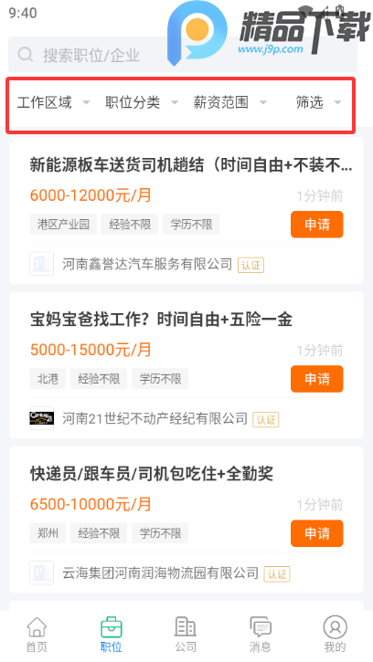 2、在上方筛选个人选择的官工作区域、职业分类、薪资范围等条件