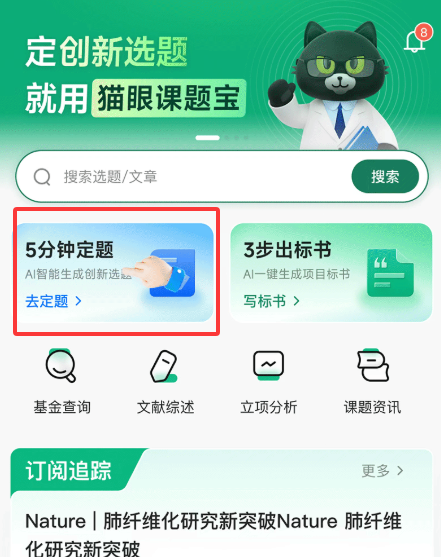 猫眼课题宝是科研人员的得力助手,基于海量基金数据与文献资源,提供智能选题、文献解析、基金解读等功能,5分钟定创新选题,10分钟生成高质量标书,助力科研人员高效完成课题申报,提升立项成功率。