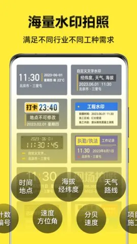 3专业水印模板,考勤打卡真实时间地点无法篡改,工作记录拍照等实时更新。