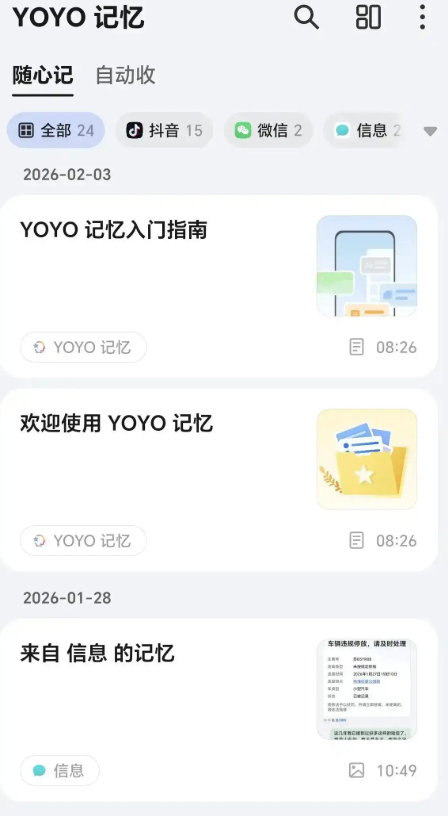 高效信息管理:YOYO记忆支持三指下滑、语音指令、跨应用同步等多种方式快速记录碎片化信息,如网页内容、聊天记录、图片、备忘事项等。这些信息会被统一存储在YOYO记忆中,方便用户随时调取和查看,大大提高了信息管理的效率。