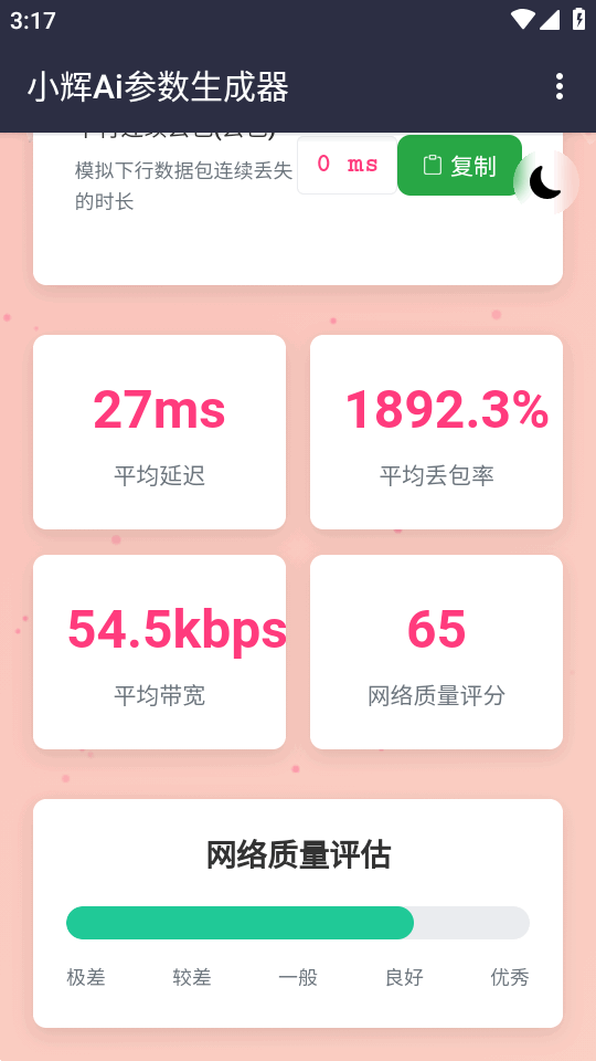 小辉Ai参数生成工具依托先进算法,能实时解构复杂场景,精准定位客群画像,监测网络质量。具备高实时性数据分析能力,可输出最优弱网配置参数建议,支持多AI引擎,适配多场景,使用便捷,还有历史记录复用功能。