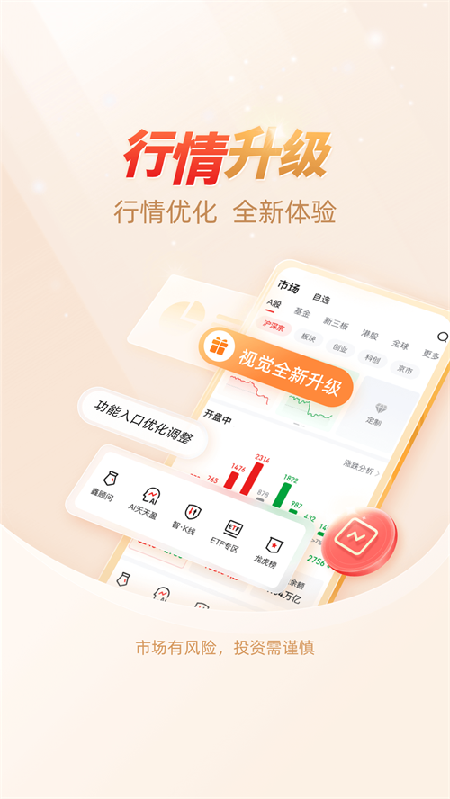 这里汇集了最新行业资讯,让你一手掌握股票市场走势,还支持在线开户等业务办理,超便捷。有专业理财顾问可咨询,还有日头条热话题实时滚动、公司研究等资讯实时推送,助你了解股票第一手消息。手机版提供市场行情,高速行情、均线指标灵活设置,丰富工具随意操作。能掌握全球股市行情,浏览全球期货和股市变化。有断线雷达,实时洞察短线机会。使用方法简单,首页搜股票代码,点击行情、交易、资讯就能分别查看股市行情、买卖股票、了解最新消息。它为投资者带来专业理财服务,捕捉市场变化,呈现数据趋势,提供决策工具,是投资好帮手。