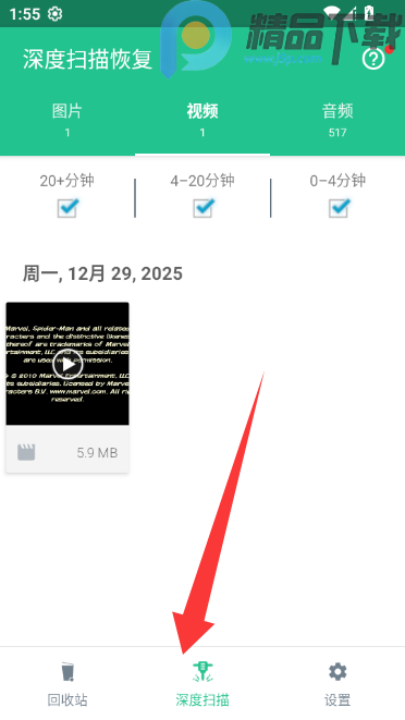 1、点击深度扫描,软件会显示被删除但可以恢复的视频文件