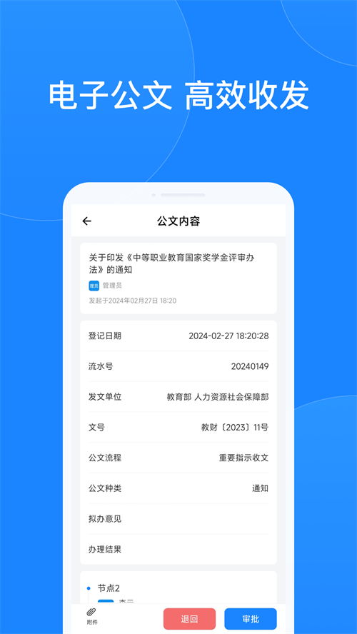 5、查看公文详情内容,可根据需要执行退回或审批操作,高效完成任务。