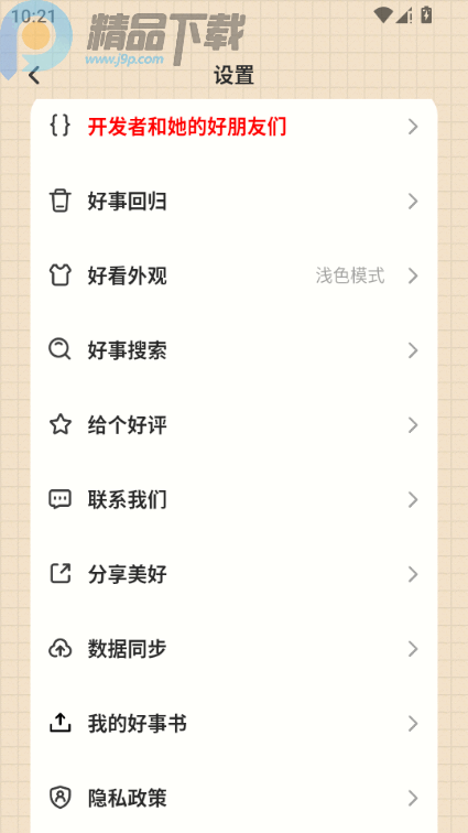 个性化定制与分类管理:支持创建自定义标签(如“美食”“旅行”“家庭”等),实现事件分类管理;提供深色/浅色主题模式切换,满足不同场景使用需求;桌面小组件功能可快速查看今日好事或待办提醒。