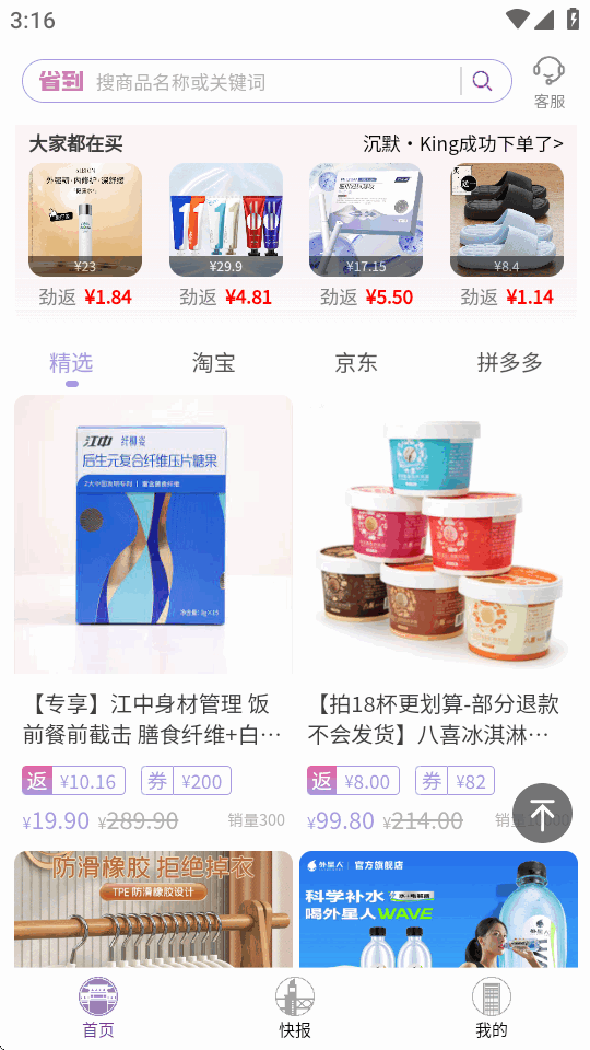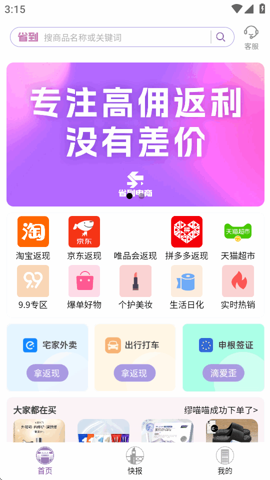 省到电商app是专注提供极致优惠体验的生活服务平台。有海量优惠券,覆盖多品类,能购物返利,实时更新优惠,精准推荐商品,整合多平台红包。各大品牌商品全,每日上新,有特价秒杀,还能自动领券、比价,多渠道登录。