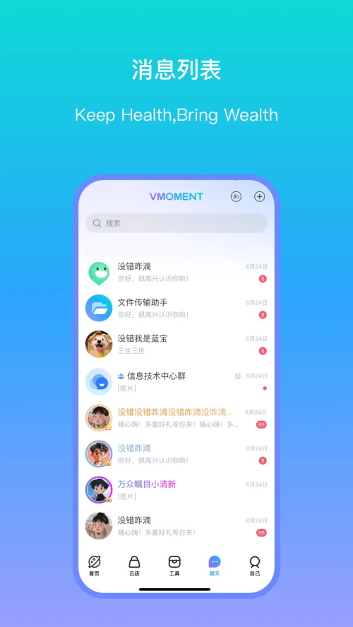 VMoment安卓版是海南即客科技推出的多功能社交软件,涵盖通讯、健康、娱乐等多方面。有自由聊天、健康课程等特色,具备在线聊天、广场动态等功能,支持多种登录方式,还可进行删除聊天记录、切换语言等操作,不断更新优化。