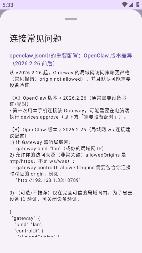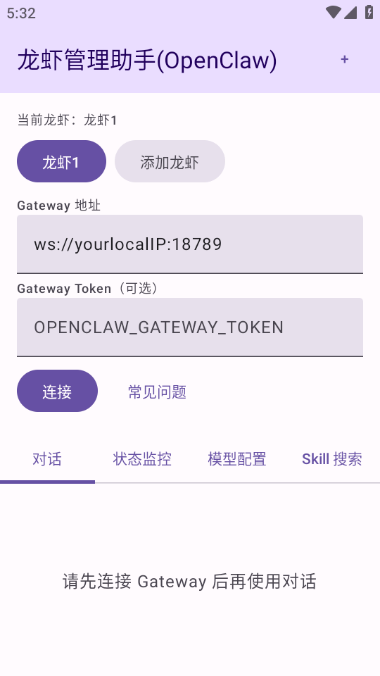 OPENCLAW_GATEWAY_TOKEN 且未使用--token,则本应用可不填 Token直接连接(仅建议在可信局域网使用)。