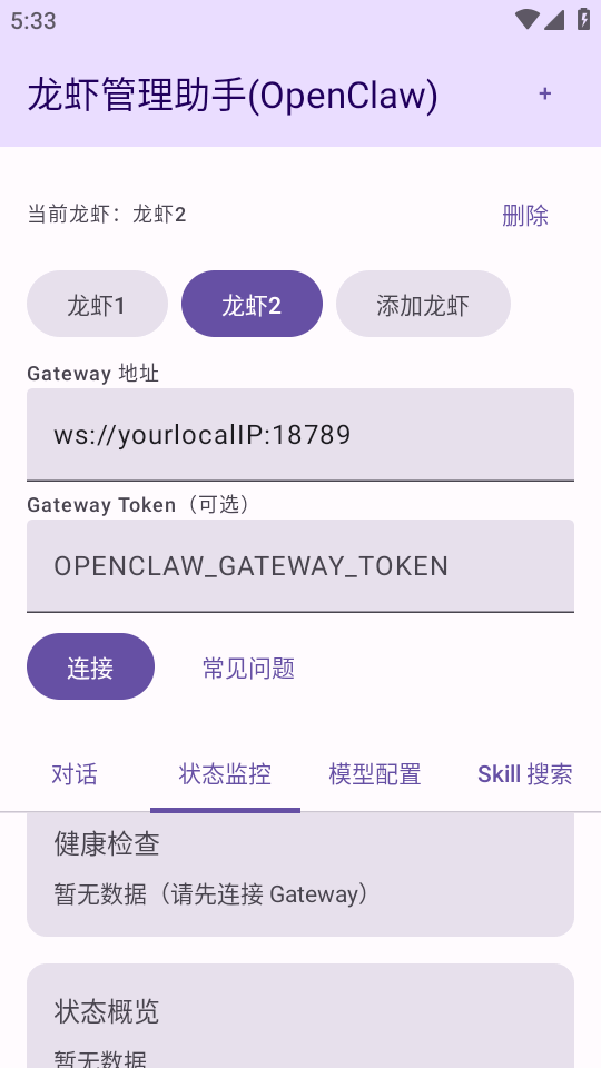 1、支持手机与OpenClaw龙虾助手本地快速配对稳定连接,提供设备状态实时监测连接自动重连多设备快捷切换等能力,保证本地管控全程稳定不掉线,操作简单直观。