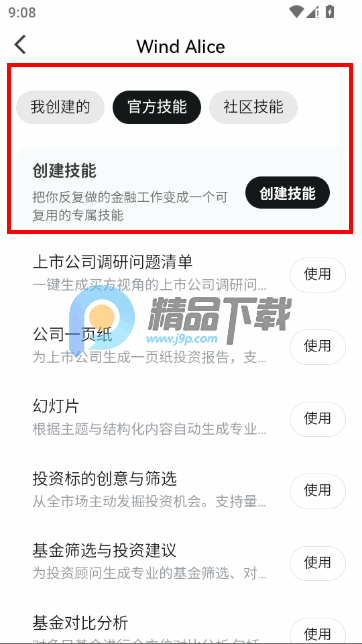 技能体系构建:提供可复用的Skill技能模块,封装金融分析方法论和操作路径。用户既可使用预设技能(如基金筛选、财报分析),也能创建个性化技能实现数字分身,支持跨任务复用分析框架。
