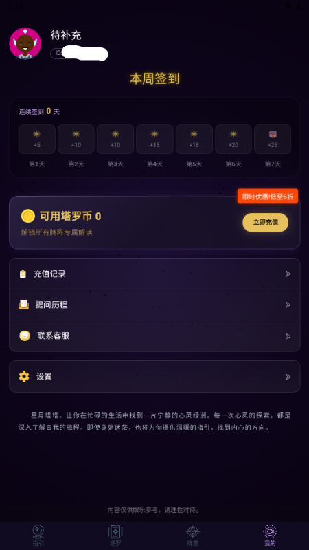 本应用所有内容(包括塔罗牌解读、文字、图片等)均仅供娱乐及自我探索参考,不涉及任何形式的命运预测、心理辅导或专业建议。请用户保持理性,以娱乐和启发的心态使用,所有决策请以现实情况为准。