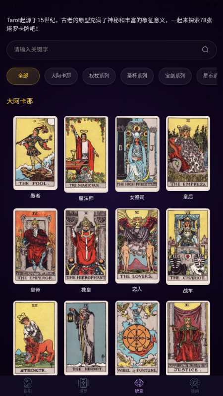 塔罗牌娱乐解读:提供78张经典韦特塔罗牌的数字化展示与基础牌意解读。用户可通过提问互动抽取卡牌,获得牌面解析,作为自我探索以及日常生活娱乐的灵感参考。