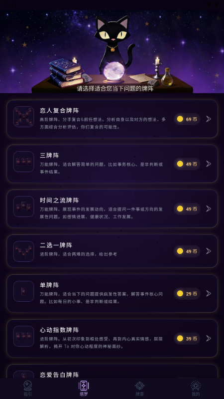 每日指引:结合塔罗牌的不同寓意,每日推送积极的生活建议与灵感提示。