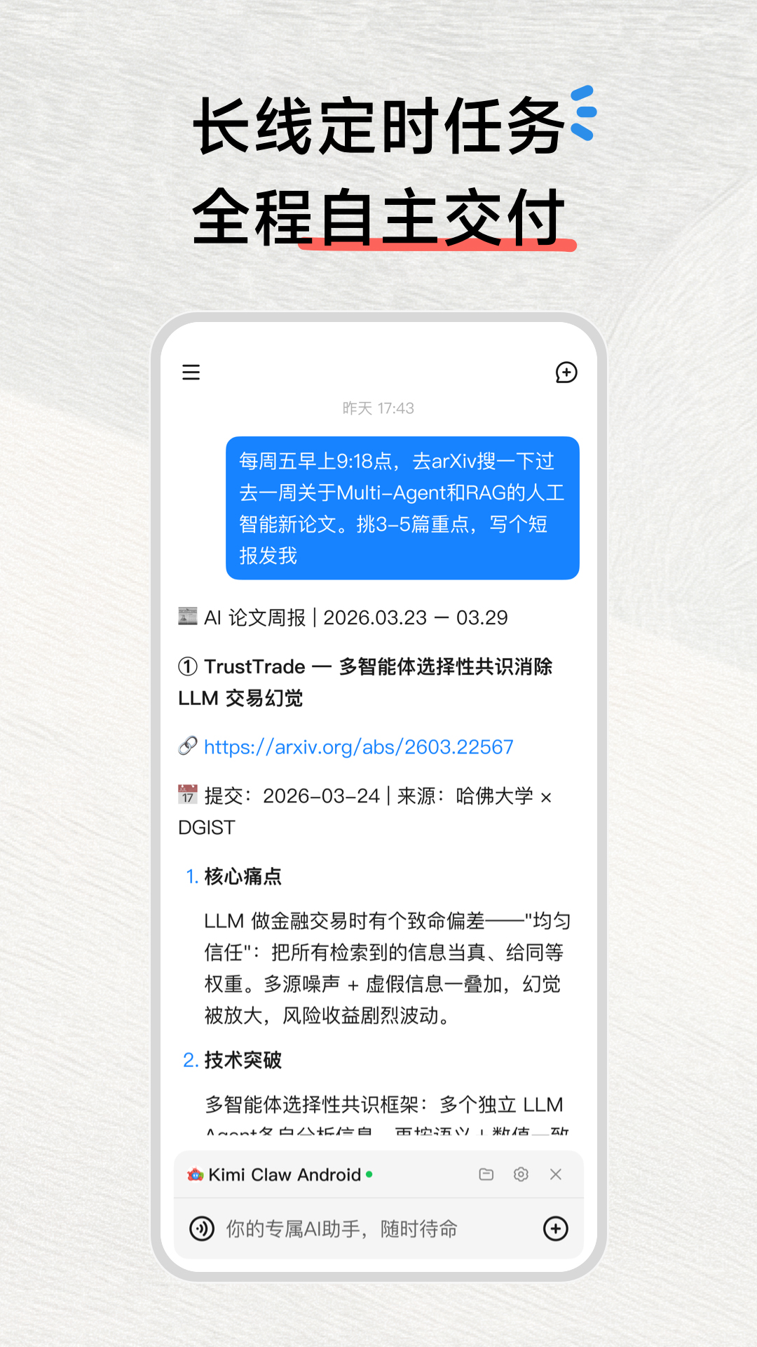 Kimi Claw 安卓版正式上线! 无需高昂的硬件投入,告别复杂的代码部署,只需一台闲置安卓手机,即可领养你的全能“打工虾”。它能看懂屏幕、跨越软件、独立思考,全自动接管你的繁杂生活与长线任务