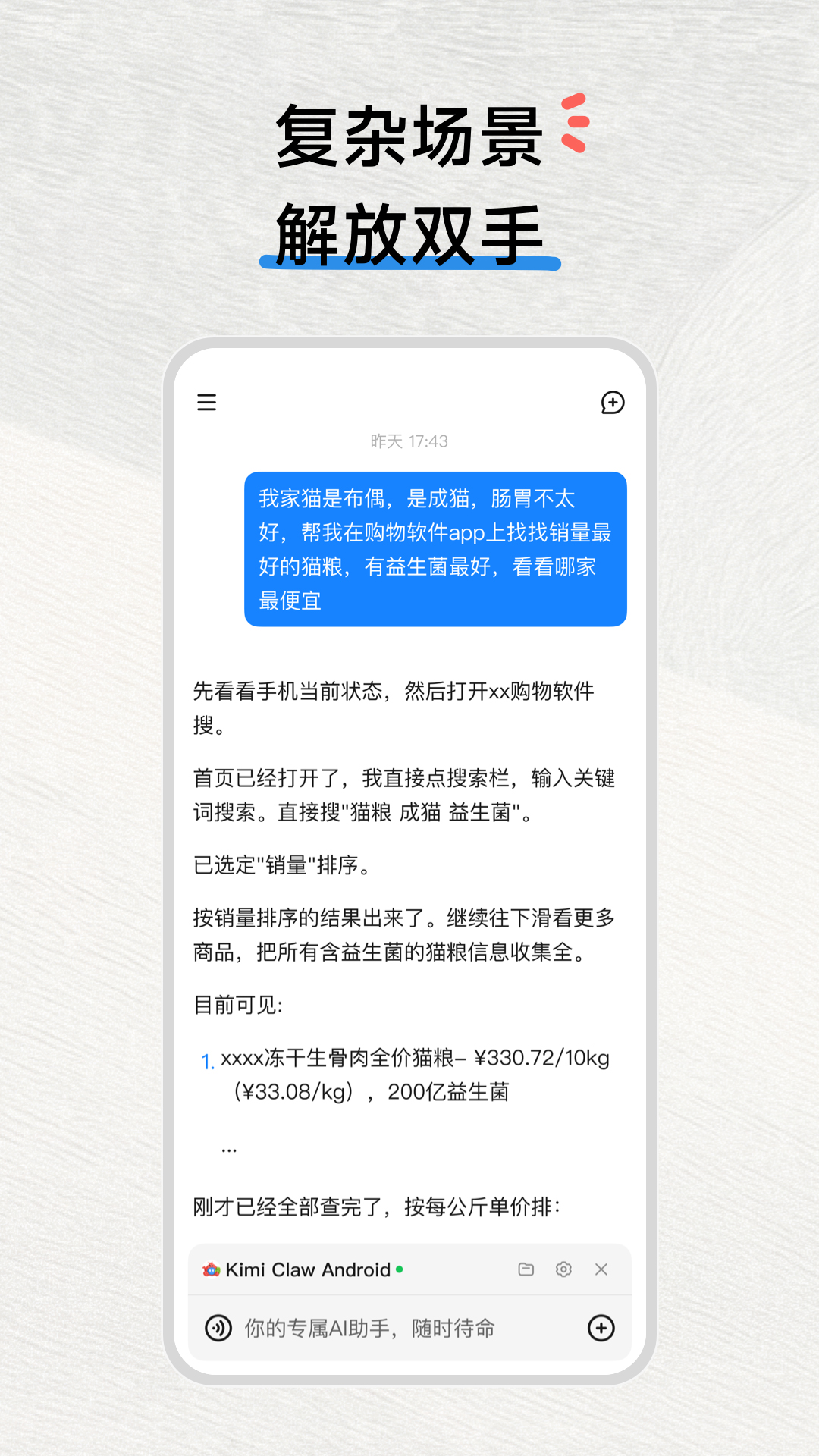 - 视觉操控,全自动跑腿 不仅能听懂指令,更能“看懂”手机屏幕。它能像真人一样在各个 App 之间跳转、点击、滑动。无论是跨平台比对百亿补贴价格,还是替你跟网店客服“对线”询问细节,琐碎的物理操作它全包了。