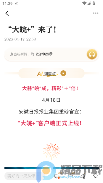 大皖Plus是安徽日报报业集团打造的旗舰传播平台,整合多个客户端资源,提供权威本地新闻、时政报道及生活服务。其“看、用、玩、圈”四大模块,满足用户资讯获取、互动分享与生活服务需求