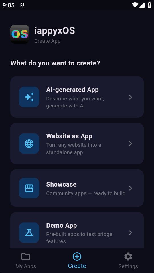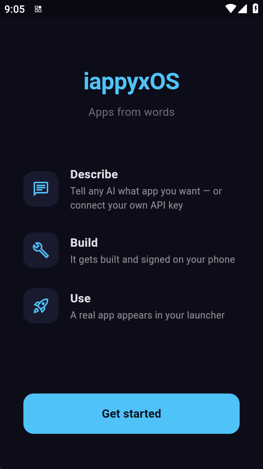 很全面好用接入最新ai智能技术的一款本地安卓应用生成工具,iappyxOS无需代码,将AI描述的需求转化为可真实安装的安卓APK应用,支持为生成的应用配置专属启动器图标,打造个性化应用外观,可以在设备本地完成应用构建、签名与安装,全程不依赖外部工具。