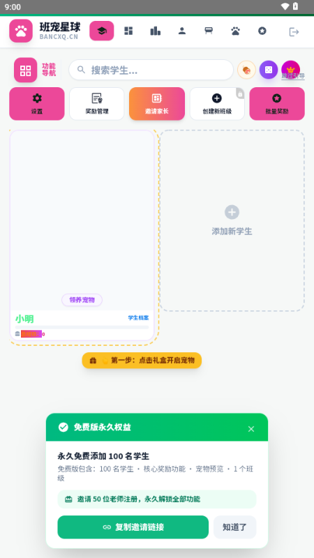 2、在这里可以免费邀请100个学生进来;