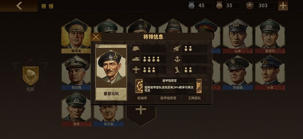 最后讲步将吧。步将选择比较多,个人认为轴心山下,同盟艾森豪、麦克阿瑟、斯利姆。龙德施泰特看似有个补给掠夺能吸血,但实测作用比较小,不如直接补兵来得快。这个技能位置还不如留给其他输出技能。山下应该是本作步兵单兵能力之王,攻守兼备,不二选择。麦克阿瑟输出比较暴力,但生存能力相比欠佳,应注意先让前排吸引火力。斯利姆我感觉很不错,因为预备队的原因,生存能力很强,在太平洋上守岛游刃有余,此外输出也不赖。