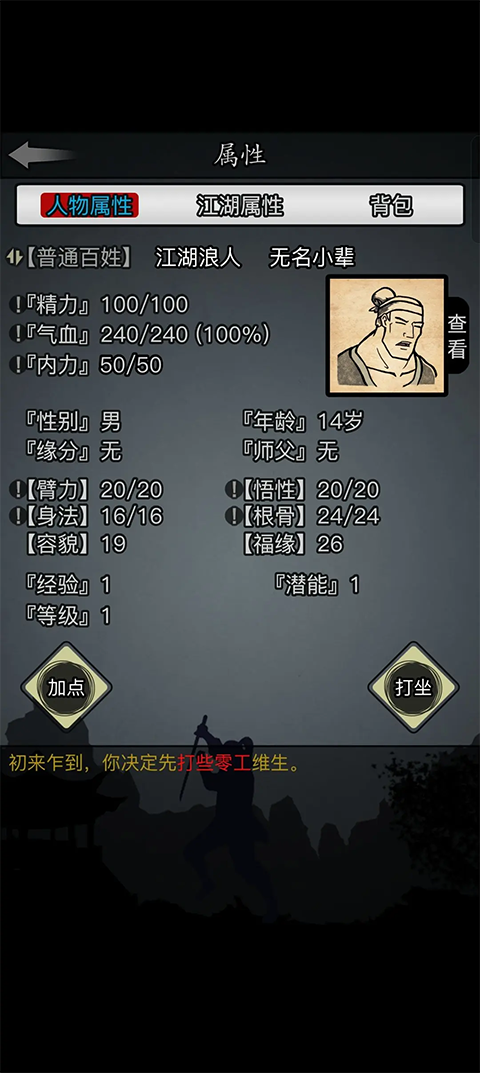 初始属性:臂力(影响攻击的伤害),身法(影响闪避),悟性(影响学习技能的消耗和对隐藏武功的学习),根骨(影响血量)四项总值为80。容貌和福缘(影响挂机收益以及隐藏物品获取)这两项总值为40。