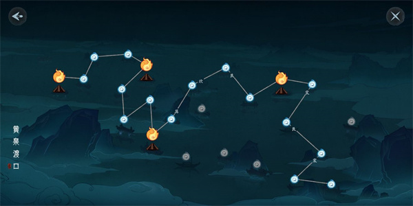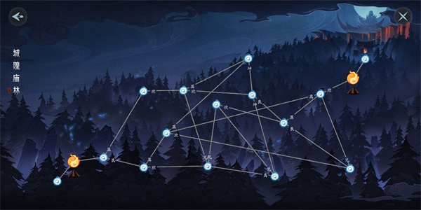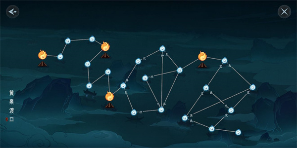 要先给萌新解释一下,这个地图,如果想要直接到达篝火是不行的,会有一个结界挡住,你需要得到三个符咒才能解开结界,红色的圈是解开结界的符咒所在地,而黄色的圈是法宝“仙酿葫芦”(这个法宝带上可以增加最大生命值)的所在地,蓝色的呢,就是额外剑魄获得地,这个路线就是不错过任何奇遇的最佳路线图