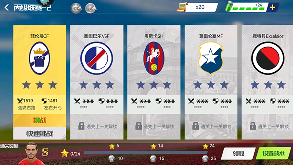 规则非常简单,球队经理带领球队战胜当前关卡的对手后,将解锁下一个关卡。战胜当前联赛的所有球队,下个联赛才会解锁。